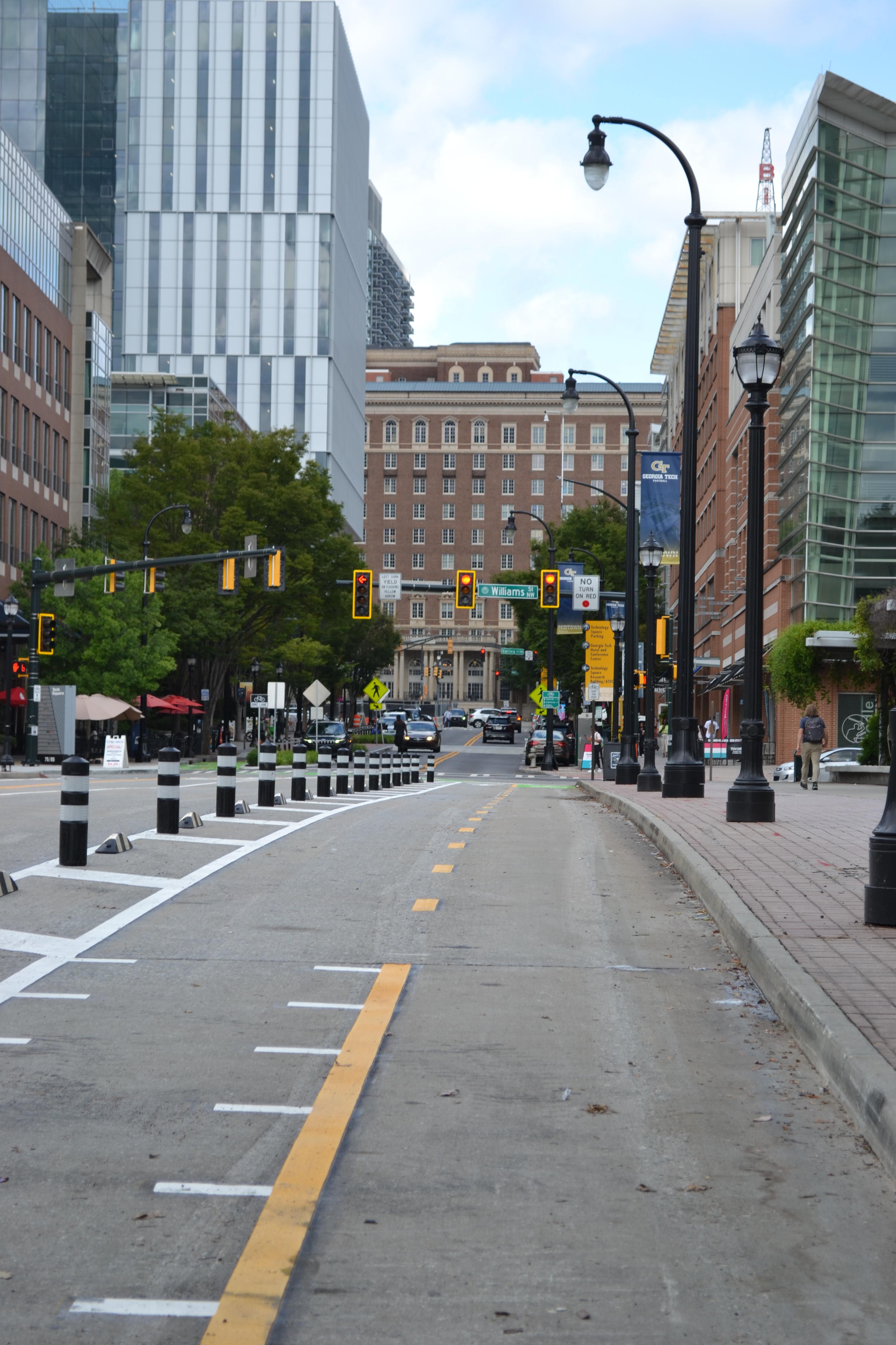 View of the newly installed cycle track looking east toward Tech Square.