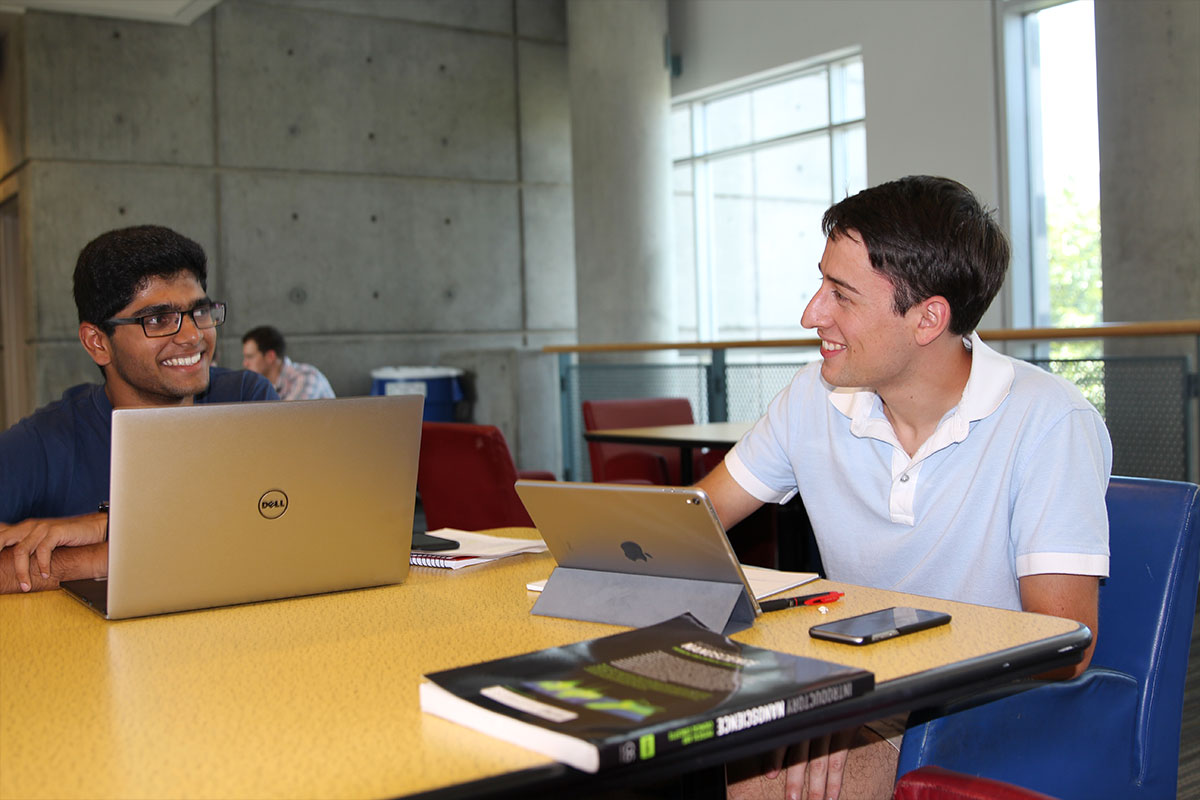 Harshith is getting a little bit of advice from an upperclassman while waiting for his first engineering class at Georgia Tech in the Love Manufacturing Building.