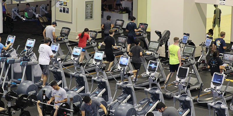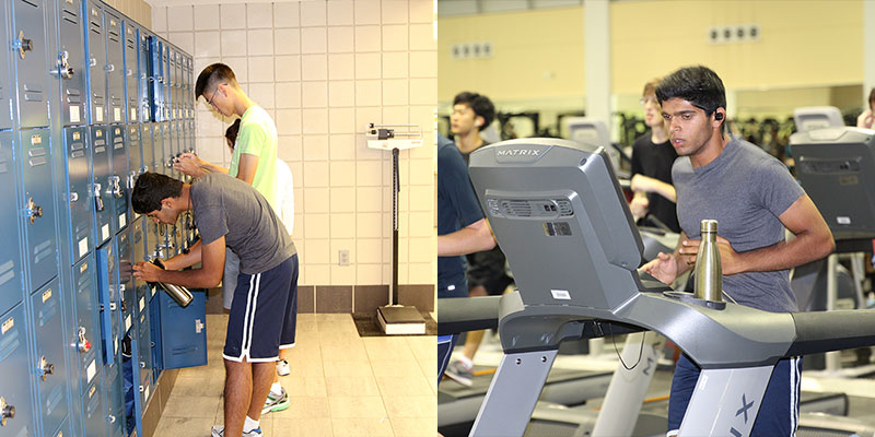 Working out at the Campus Recreation Center, Harshith finds a treadmill to put in a couple of miles on.