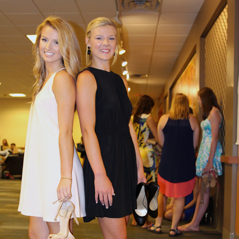 Lauren and Sarah keep heels in hand — that way they can change into them in a moment’s notice. There’s a fair amount of walking in store as they are led from the Student Center to all of the sorority houses on campus. It’s a long night ahead, and the recruits are asked not to use their cell phones for the duration of the evening. This evening of recruitment is preference night, where Lauren will pick the sorority she feels most drawn to.