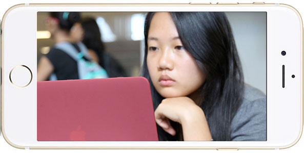 Kathy uses some down time to look over her schedule and get her bearings in the Clough Undergraduate Learning Commons. It is a perfect place to get a few things done before her next class, which just happens to be in the same building — her second computer science course of the day.