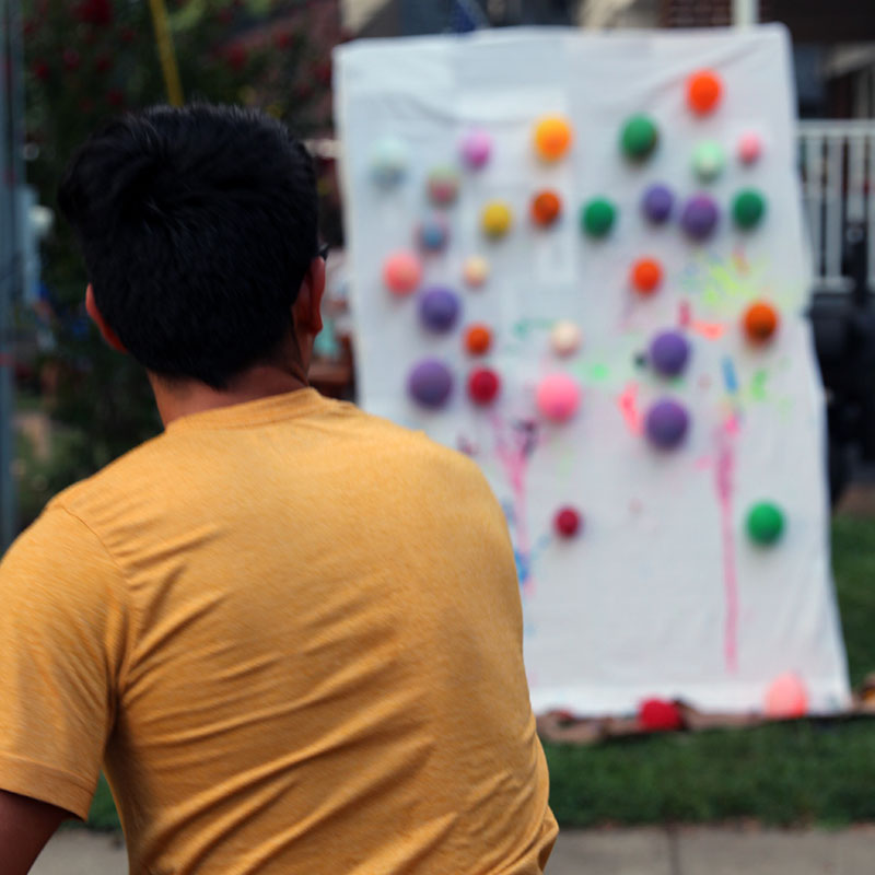 Sebastian makes some new friends at the Christian Campus Fellowship’s paint party. Students try their hand at calculating a perfect trajectory to launch darts by hand and obliterate paint-filled balloons.