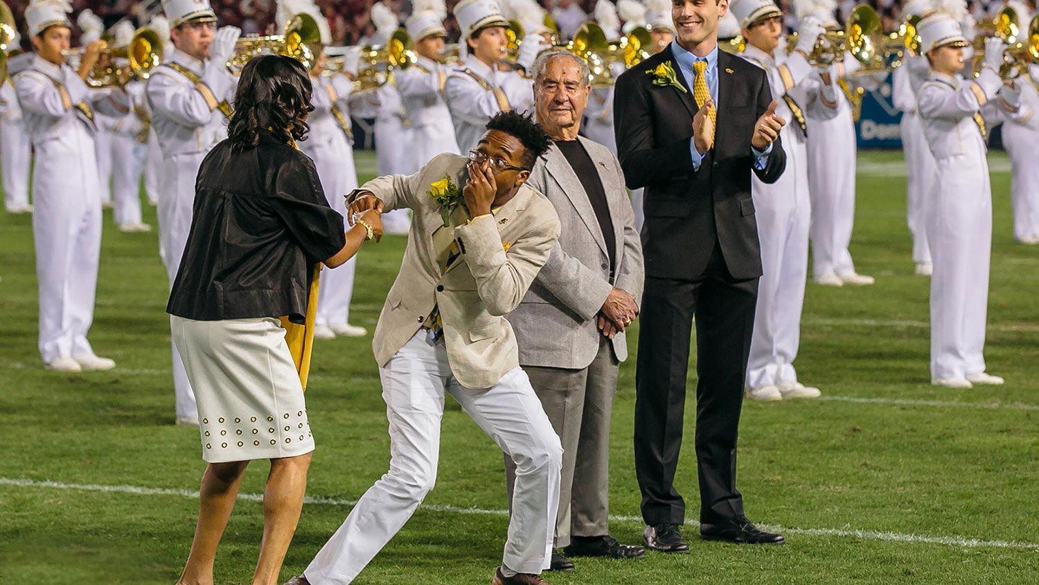 Johnson sunk to the ground after his name was announced as the new Mr. Georgia Tech.