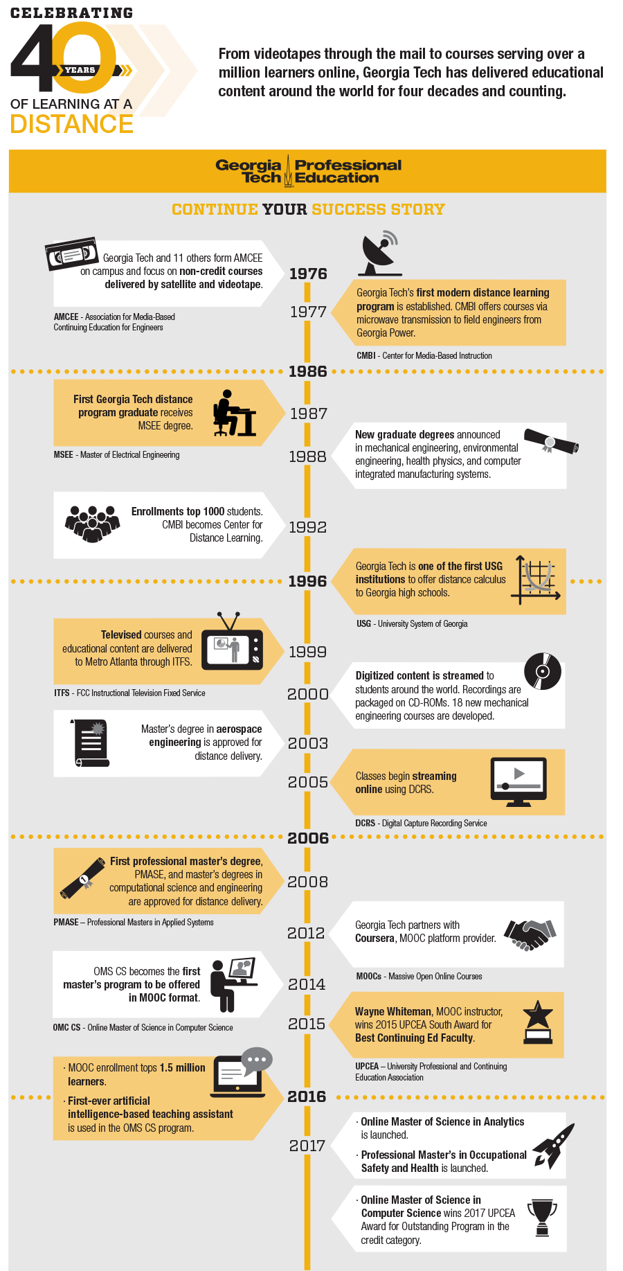 This was not entirely uncharted territory for Tech, which began offering distance learning more than 40 years ago. The first distance program graduate received a Master of Science in Electrical Engineering in 1987. The following year, new graduate programs were added, including mechanical engineering, environmental engineering, and health physics. Today, the Institute offers seven traditional online master’s degrees. But the significantly lower cost of an OMS degree, the increased accessibility for students, and the online format set it apart from traditional distance learning.