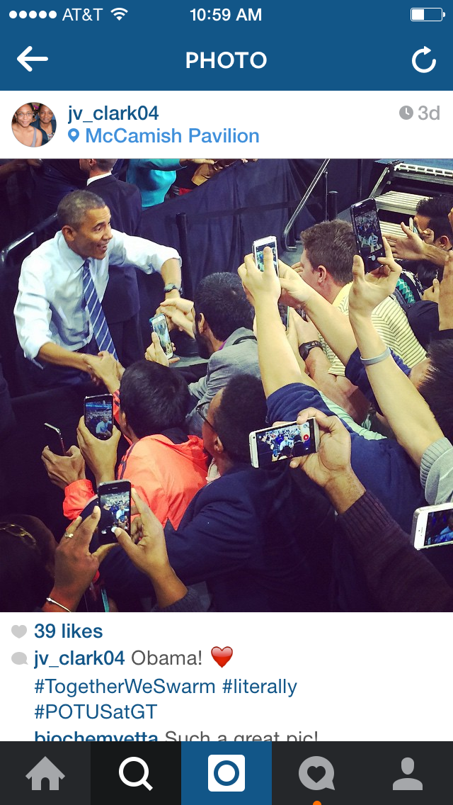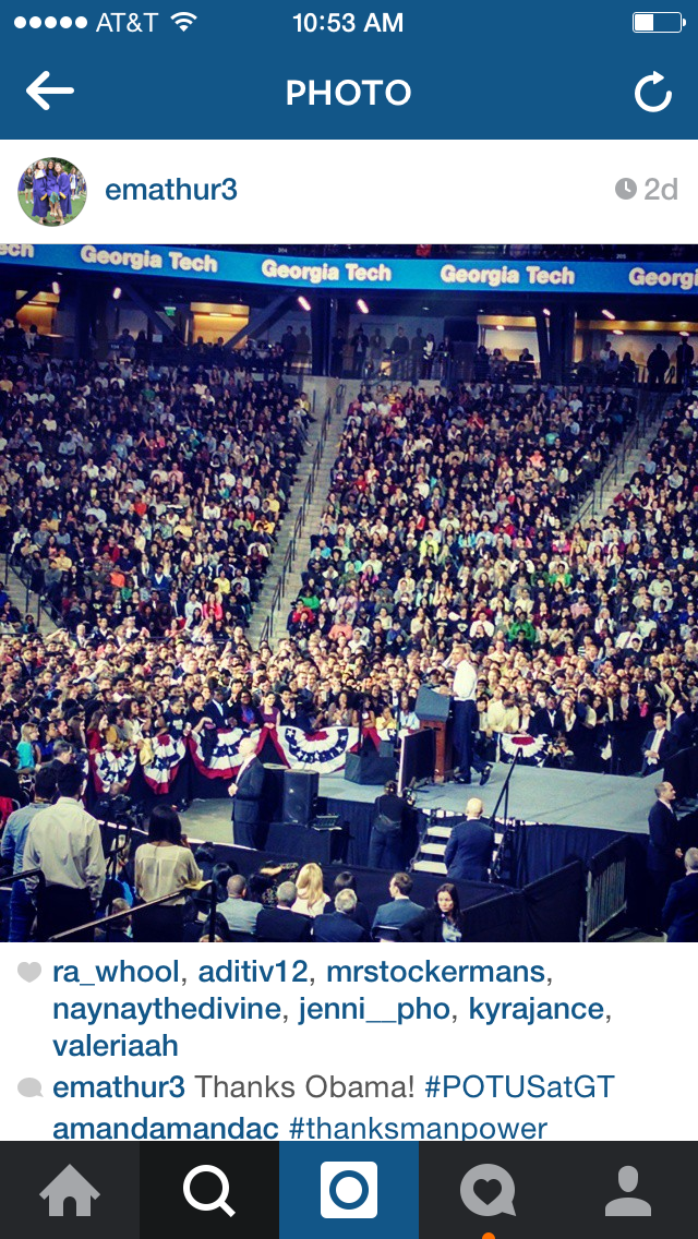 Social media websites exploded with photos, videos, and comments about the President’s stop at Georgia Tech. The hashtag #POTUSatGT generated over 2 million timeline deliveries on Twitter and was trending in Atlanta for much of the morning and afternoon. Hundreds of instragram photos were shared using that same hashtag. Each photo and tweet telling a unique part of the story of the 44th president’s visit and it’s impact on our campus and the nation.