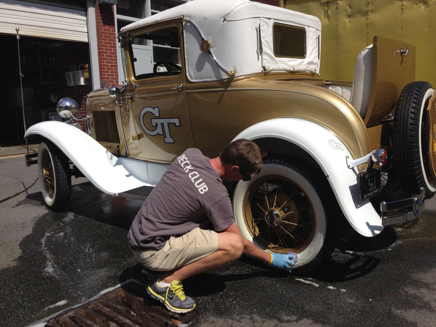 Of course, since taking the wheel in January, he’s fallen in love with the job. One of the Reck Club’s responsibilities is to maintain the 1930 Ford Model A Sport coupe, and Ahlers has the leading role. He spends about 10-12 hours a week maintaining and driving Tech’s beloved mechanical mascot: driving it, washing it, repairing it, changing its oil, and caring for its transport to away games and other appearances.